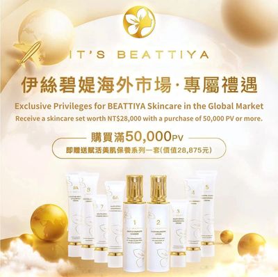 To reward overseas market expansion, we are offering a skincare set worth NT$28,000 with every purchase of 50,000 PV or more. This gesture reflects our sincerity and determination, and we hope to earn your support.